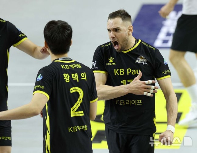 [의정부=뉴시스] 고범준 기자 = 5일 경기도 의정부시 경민대학교 기념관(체육관)에서 열린 2024-2025 V-리그 남자부 KB손해보험 스타즈와 현대캐피탈 스카이워커스의 경기, KB손해보험 비예나가 득점에 성공하자 기뻐하고 있다. 2025.02.05. [email protected]