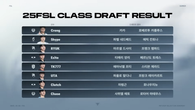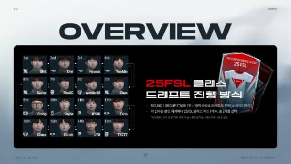 이날 행사는 오는 13일부터 진행되는 16강 토너먼트의 대진 지명과 함께 이번 시즌에 새롭게 적용된든 '25FSL 클래스 카드'를 각 선수들에 지정하기 위해 마련됐으며, '25FSL 클래스 카드'의 드래프트와 16강 대진 지명식 순으로 진행됐다.