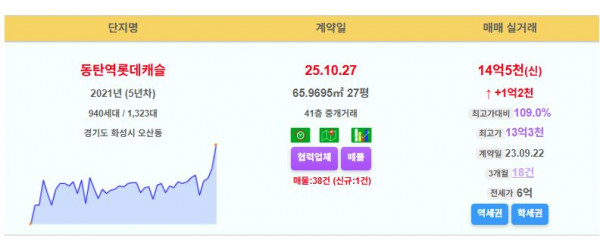 화성시 동탄역롯데캐슬 27평 14.5억 신고가