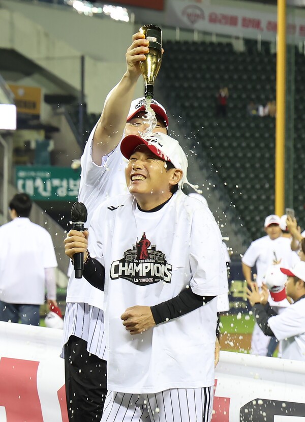 10월 1일 정규시즌 우승이 확정되자, 샴페인 세례를 받고 있는 염경엽 감독. (사진=LG 트윈스)