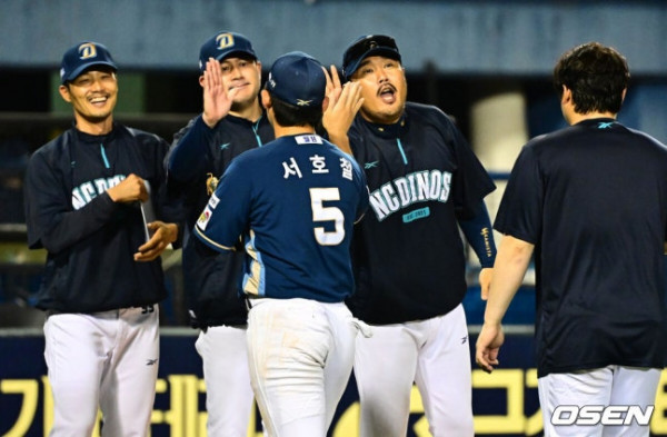 [OSEN=잠실, 지형준 기자] 프로야구 LG 트윈스가 자력 우승에 실패했다. NC 다이노스는 파죽의 8연승을 이어갔다.  NC는 1일 서울 잠실구장에서 열린 2025 KBO리그 LG와 경기에서 7-3으로 승리했다. 경기를 마치고 NC 이호준 감독이 승리를 기뻐하고 있다. 2025.10.01 /[email protected]