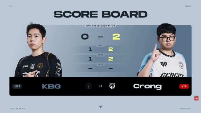 30일 잠실 DN 콜로세움에서 펼쳐진 '2025 FC 온라인 슈퍼 챔피언스 리그(FSL)' 서머 32강 D조 최종전, BNK 피어엑스 'KBG' 김병권과 젠시티 '크롱' 황세종의 대결에서 '크롱'이 2:0으로 승리했다. 두 세트 내내 먼저 두 골을 올린 '크롱'은 끈질긴 'KBG'의 추격을 뿌리치며 16강으로 향했다.