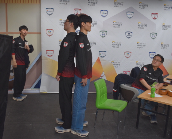 ▲ 프로기사 448명 가운데 세 손가락에 드는 큰 신장(187cm)을 자랑하는 최민서(오른쪽)와 안국현이 머리를 맞대고 키를 재보고 있다. 장신 선수들이 즐비한 정관장은 실제로 프로농구단 KGC도 보유하고 있다.