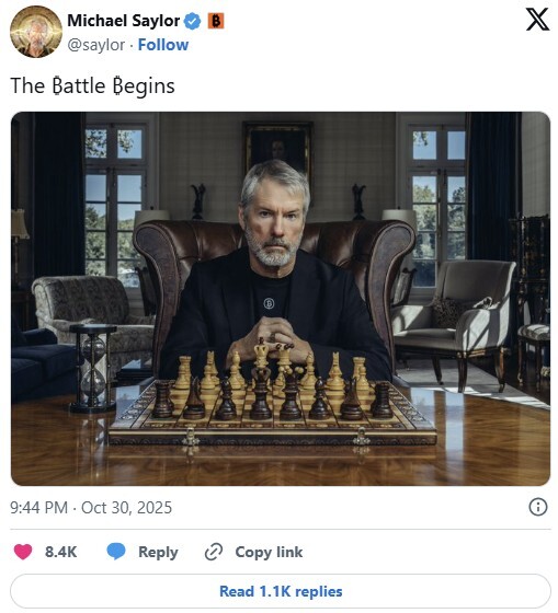10월 30일(현지시간) 암호화폐 전문 매체 유투데이에 따르면, 세일러는 X에 체스판 앞에 앉아 모래시계가 놓인 사진과 함께 “전투가 시작됐다(The ₿attle ₿egins)”라는 글을 게시하며 장기전과 전략적 승부를 암시했다. 그의 발언은 최근 비트코인 가격 조정에도 불구하고 불장 지속 의지를 밝힌 것으로 해석된다.