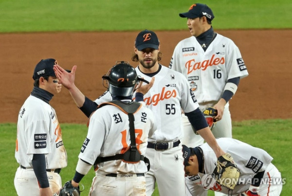 (대전=연합뉴스) 김준범 기자 = 30일 대전 한화생명 볼파크에서 열린 2025 프로야구 KBO리그 포스트시즌 한국시리즈 4차전 LG 트윈스와 한화 이글스의 경기. 8회초 2사 2루 때 한화 와이스가 마운드에서 내려가며 최재훈과 인사하고 있다. 2025.10.30 [email protected]