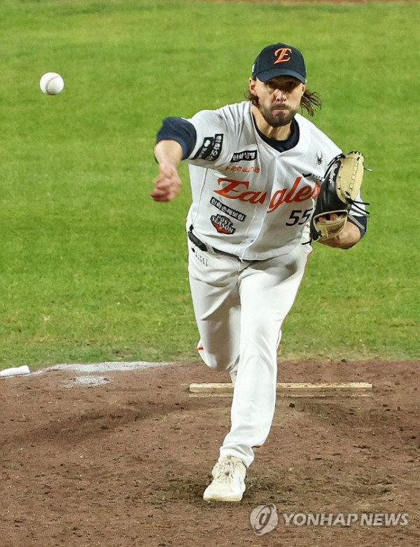 (대전=연합뉴스) 김준범 기자 = 30일 대전 한화생명 볼파크에서 열린 2025 프로야구 KBO리그 포스트시즌 한국시리즈 4차전 LG 트윈스와 한화 이글스의 경기. 8회초 마운드에 오른 한화 와이스가 역투하고 있다. 2025.10.30 [email protected]
