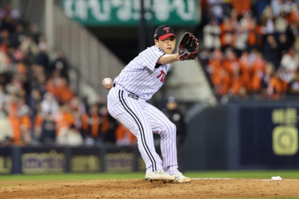 LG 함덕주가 29일 열린 한화와의 한국시리즈 3차전에 앞서 포즈를 취하고 있다. 대전=이형석 기자