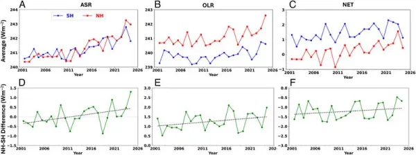 연구진은 2001~2024년 3개의 세레스(CERES=구름과 지구 복사 에너지 시스템) 관측 위성에서 수집한 데이터를 기반으로 지난 24년 동안 지구 밝기가 어떻게 변화했는지 조사했다. 위성이 측정한 햇빛 입사량, 복사량 데이터를 고해상도 분광 이미지, 눈과 구름 지도, 컴퓨터 기후 모델과 결합한 결과, 북반구가 남반구보다 더 어두워지고 있다는 사실이 드러났다. 북반구는 남반구에 비해 10년마다 1㎡당 약 0.34와트의 태양 에너지를 더 흡수했다.