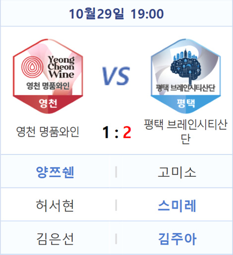 승부는 마지막 3국에서 갈렸다. 평택의 김주아가 영천의 김은선을 상대로 초반 불리한 형세를 극복하고 역전승을 거두며 팀의 2-1 승리를 완성했다. 초반 불리한 흐름으로 시작한 김주아는 중반 하변 접전에서 결정적인 득점을 올리며 판세를 자신의 흐름으로 가져왔다. 이후 단 한 번의 기회도 허용하지 않으며 우세를 지켜내며 자신의 손으로 팀 승리를 확정지었다.