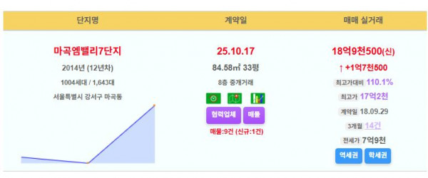 강서구 마곡엠밸리7단지 33평 18.95억 신고가