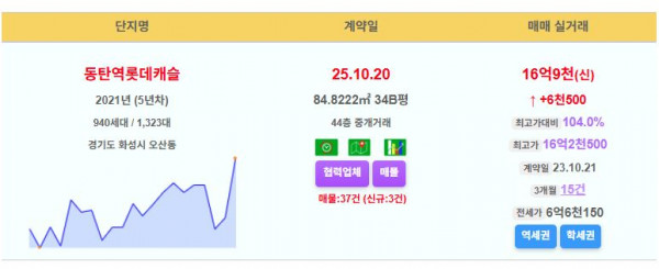 화성시 동탄역롯데캐슬 34평 16.9억 신고가