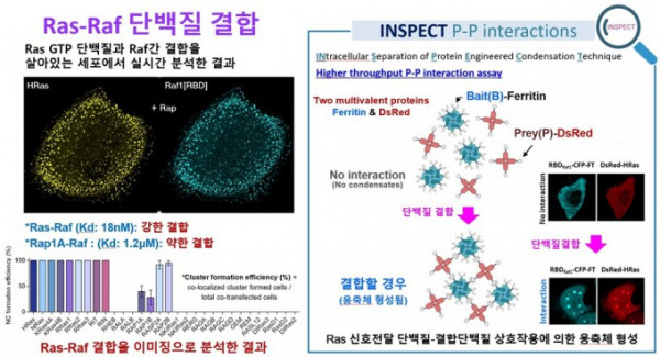 INSPECT 기술은 단백질이 서로 붙을 때 자연스럽게 구분된 영역이 생기는 '상분리(phase separation)' 현상을 인공적으로 만드는 기술이다. 세포 속에서 단백질들이 실제로 어떻게 결합하는지를 형광 신호로 직접 볼 수 있다.