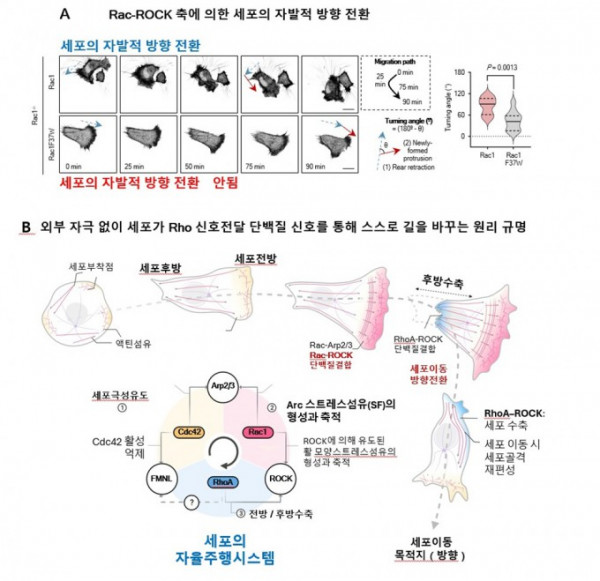 연구팀은 세포 이동을 조절하는 핵심 단백질인 'Rho 계열 단백질(Rac1, Cdc42, RhoA)'의 작동 방식을 새롭게 분석했다. 그 결과 이 단백질들이 단순히 세포의 앞뒤를 나누는 역할만 하는 것이 아니라 어떤 단백질과 결합하느냐에 따라 세포가 직진할지 방향을 바꿀지가 달라진다는 사실을 발견했다.