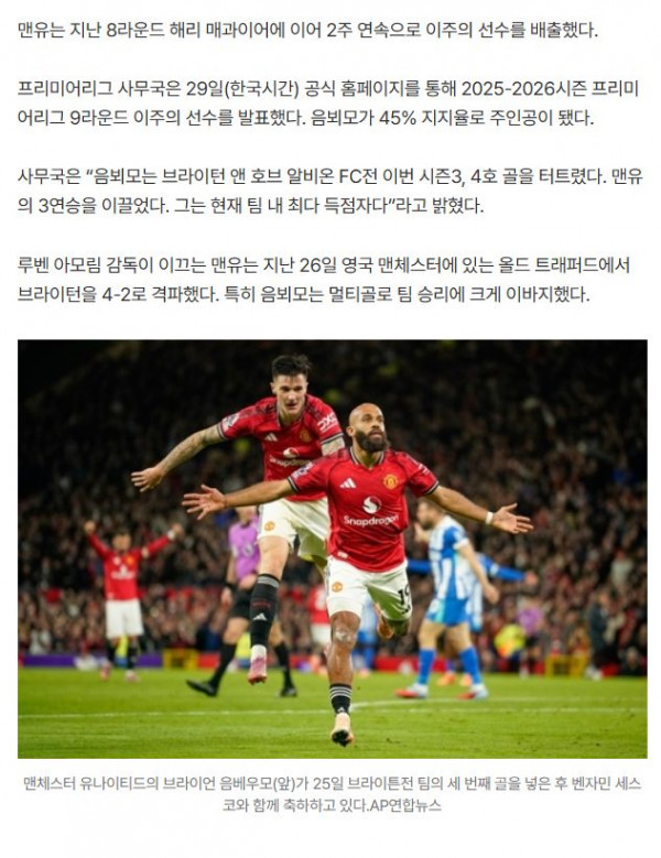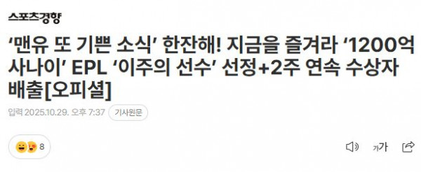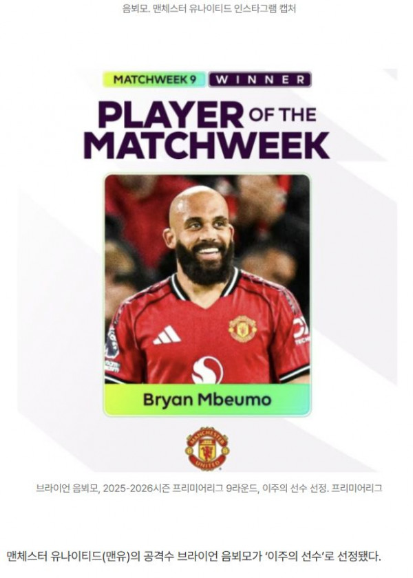 ‘맨유 또 기쁜 소식’ 한잔해! 지금을 즐겨라 ‘1200억 사나이’ EPL ‘이주의 선수’ 선정+2주 연속 수상자 배출[오피셜]