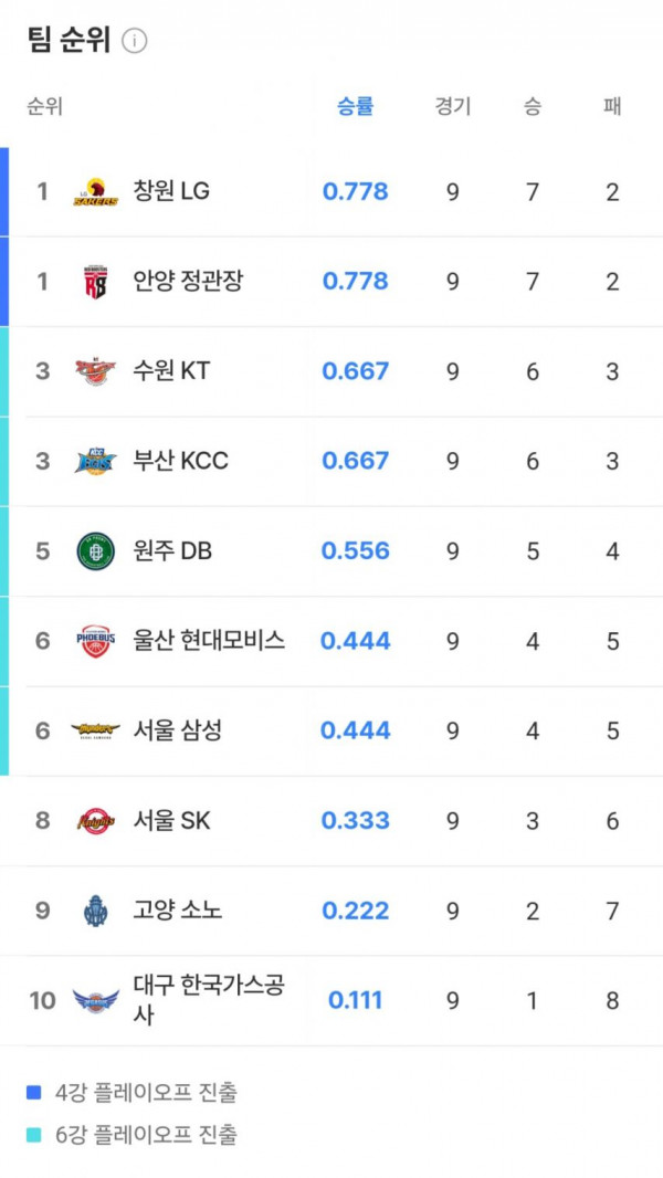 | 순위 | 팀 | 경기 | 승 | 무 | 패 | 승점 |