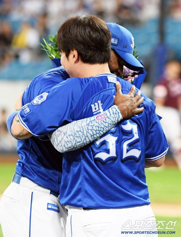 25일 대구 라이온즈파크에서 열린 삼성 라이온즈와 키움 히어로즈 경기. 5회말 1사 3루 삼성 디아즈가 적시타를 날리며 단일 시즌 최다 타점(147타점) 신기록을 달성했다. 수비 교대 때 박병호와 디아즈가 포옹을 나누고 있다. 대구=박재만 기자 [email protected]/2025.09.25/