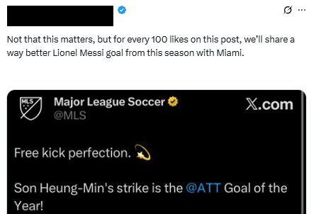 마이애미 관련 유명 한 팬페이지는 손흥민의 프리킥 영상을 게시하며 "'좋아요'가 100개 달릴 때마다 이번 시즌 마이애미에서 나온 메시의 훨씬 더 멋진 골을 하나씩 공개하겠다"고 비아냥댔다.