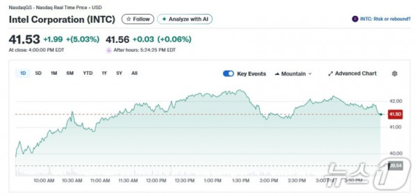 28일(현지 시각) 뉴욕증시에서 인텔은 5.03% 급등한 41.53달러를 기록했다. 이로써 시총도 1979억달러로 불었다.