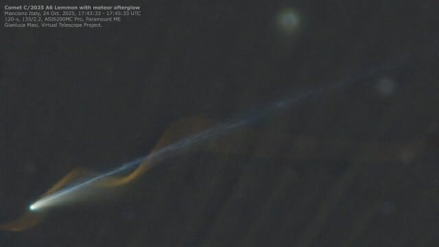 가상 망원경 프로젝트 천문학자 지안루카 마시가 빛나는 유성 궤적이 레몬 혜성의 꼬리를 감싸고 있는 모습을 포착했다. (출처=지안루카 마시, 가상 망원경 프로젝트)