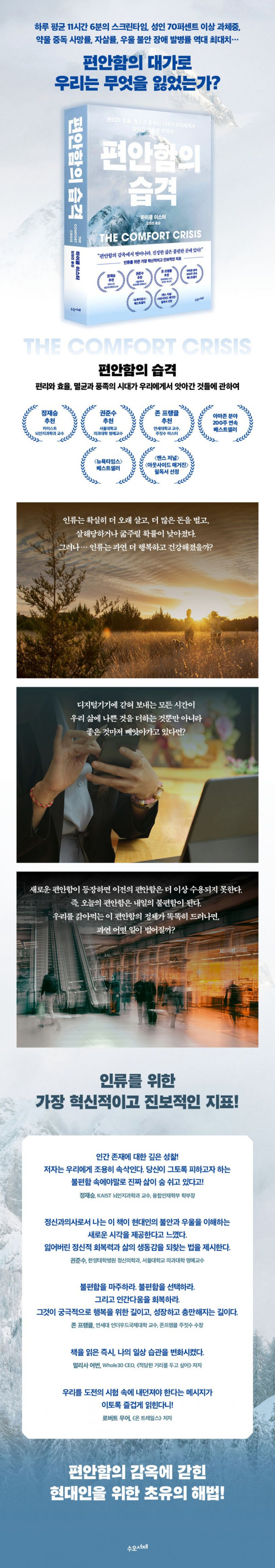 이 책은 ‘편안함이 곧 행복과 충만함으로 이어진다’는 현대의 지배적인 서사에 과감히 도전한다. 인류가 잃어버린 감각, 불편함의 진화적 효용을 탐구하고, 중독, 우울증, 불안, 자살, 비만, 외로움증후군, 번아웃, 삶의 의미 상실 등 현대인들이 당면한 문제가 어떻게 편안함과 연결되는지 심도 있게 분석한다.