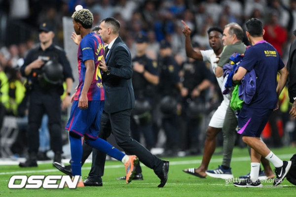 한 차례 진정되는 듯했지만 비니시우스가 멀리서 다시 야말을 향해 고함을 지르며 감정이 재점화됐다. 벤치에 있던 안토니오 뤼디거, 다비드 알라바, 하피냐까지 그라운드로 뛰어들었고 현장은 난장판이 됐다. 결국 마르쿠스 소르그 코치가 급히 선수들을 제지하며 큰 충돌로 번지는 것을 가까스로 막았다.