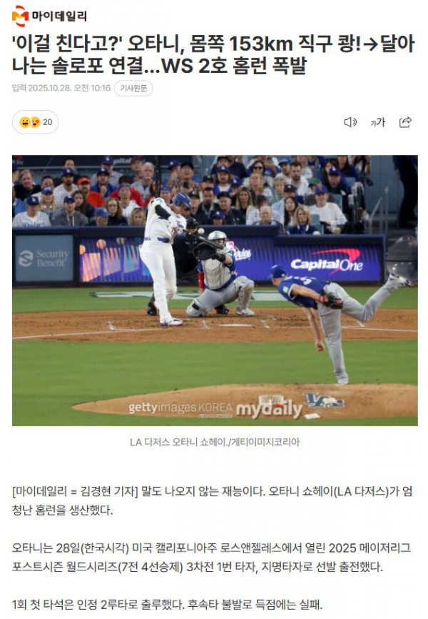 '이걸 친다고?' 오타니, 몸쪽 153km 직구 쾅!→달아나는 솔로포 연결…WS 2호 홈런 폭발
