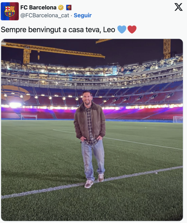 바르셀로나 구단은 10일(한국시간) 공식 소셜미디어(SNS)에 메시가 캄노우를 방문한 사진을 올리며 "언제나 환영받을 집이야, 레오"라고 게시물을 올렸다.