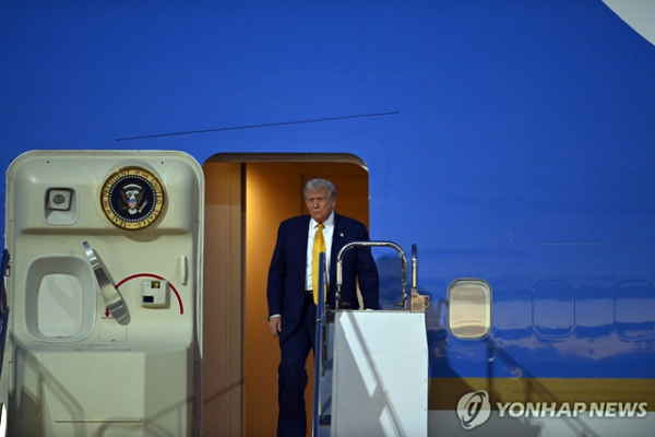 27일 일본에 도착해 에어포스원서 내리는 트럼프 대통령. [연합뉴스]