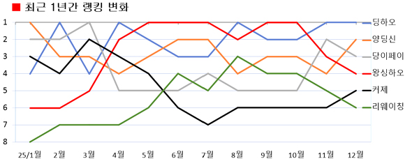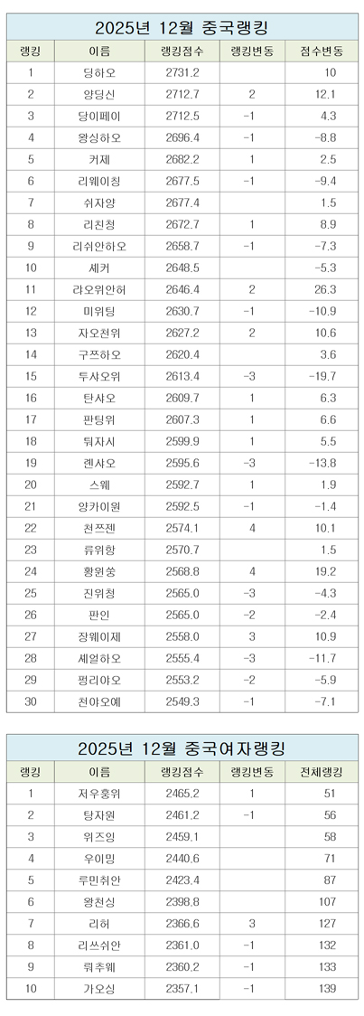 12월 중국랭킹… 딩하오, 2개월 연속 1위