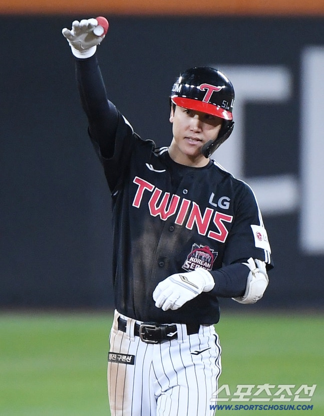 31일 대전 한화생명볼파크에서 열린 LG와 한화의 한국시리즈 5차전. 7회초 1사 구본혁이 2루타를 친 후 기뻐하고 있다. 대전=정재근 기자 [email protected]/2025.10.31/