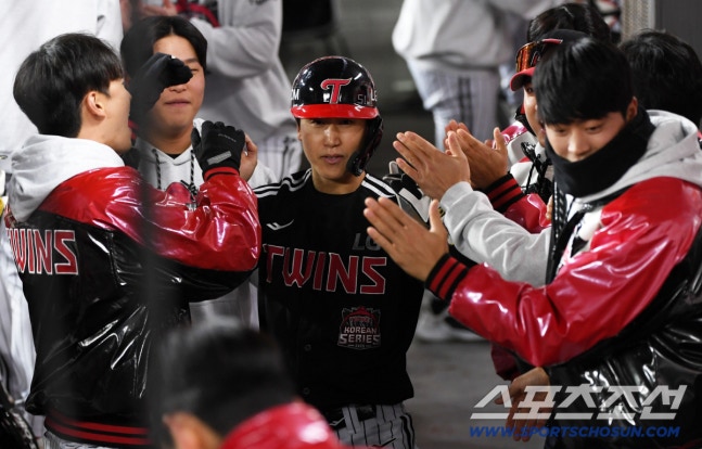 29일 대전 한화생명볼파크에서 열린 한국시리즈 3차전 한화 이글스와 LG 트윈스의 경기. 3회초 2사 1루 LG 신민재 안타 때 득점한 구본혁이 환호하고 있다. 대전=박재만 기자 [email protected]/2025.10.29/