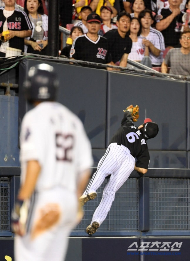 25일 잠실구장에서 열린 두산 베어스와 LG 트윈스의 경기. 9회말 2사 1,3루 두산 이유찬 타구를 LG 구본혁이 펜스를 올라타고 점프해 잡아내고 있다. 잠실=박재만 기자 [email protected]/2025.07.25/