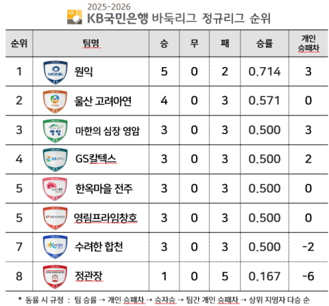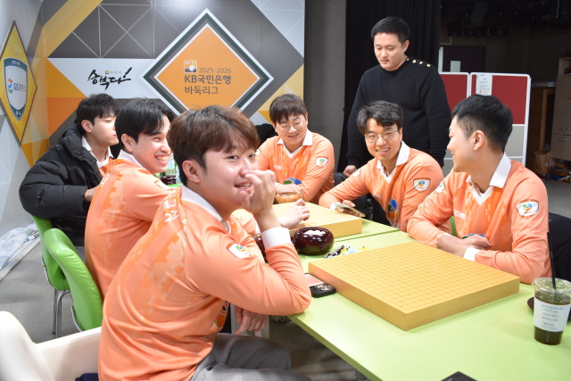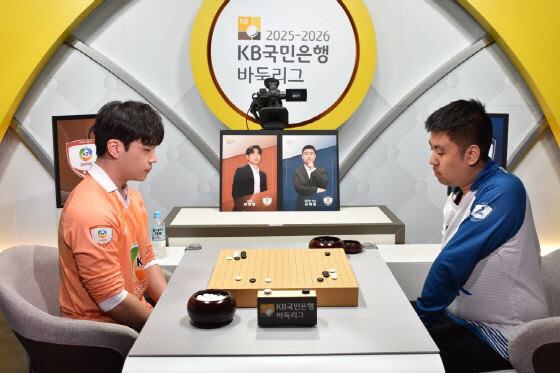 ○● 2025-2026 KB국민은행 바둑리그는 내년 2월까지 8개 팀이 더블리그 방식으로 총 14라운드 56경기를 치른다. 정규리그 상위 4개 팀이 포스트시즌에 진출해 우승 상금 2억 5,000만원을 놓고 최종 대결을 펼친다. 매 경기 5판 3선승제로 진행되며, 기본 시간 1분에 착수할 때마다 15초가 추가되는 피셔 룰 방식이 적용된다.