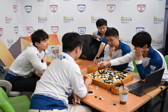 ▲ 위기에서 팀을 구한 3국 승리 후, 진위청이 동료들과 함께 복기하고 있다.