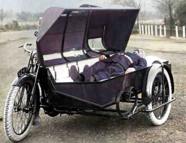 세인트존스 협회의 초기 구급차. 환자는 관과 비슷한 사이드카에 배치되어 해치로 호흡하며, 운송 시에는 뚜껑이 닫혔습니다. 약 1922년