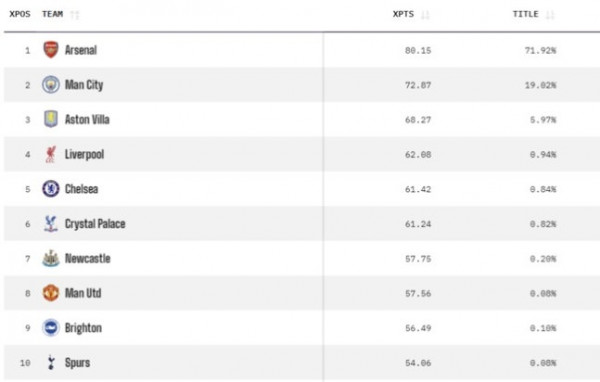 그러나 슈퍼컴퓨터는 여전히 아스널의 우승을 예측하고 있다. 축구 통계 매체 '옵타'에 따르면 현재 아스널의 우승 확률은 약 72%로, 2위 맨시티의 19%, 3위 빌라의 6%를 크게 앞섰다. 장기 레이스에서 결국 아스널의 우세를 예상한 것이다.