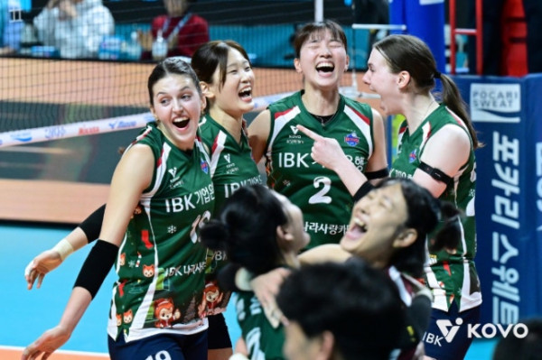 기업은행 선수들이 지난 10일 GS칼텍스와 경기에서 승리한 뒤 기뻐하는 모습. 한국배구연맹
