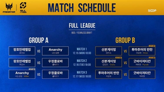 A조 첫 경기는 '왕호만레벨업'과 'Anarchy(애디, 병현, 권지인, 나는상윤, 아키아)'의 맞대결로 펼쳐진다.