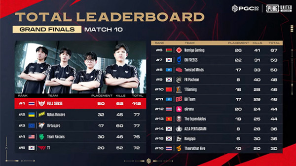 마지막으로 남은 T1이 VP의 압박을 밀어내고 자기장 진입에는 성공했지만 이 과정에서 두 명을 잃었고, 이후 미스 플레이로 인원을 잃은 후 상대의 공격에 탈락했다. 결국 마지막에는 태국 두 팀의 대결 구도애서 승리한 FS가 치킨을 가져가며 선두를 지켰다.