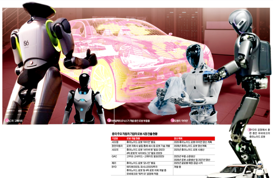 이미 중국에서는 약 20개 자동차 관련 기업이 로봇 산업에 진출한 것으로 조사됐다. 창안자동차, GAC, 체리, BYD 등 굵직한 전통의 완성차 기업 뿐만 아니라 샤오펑, 그리고 샤오미 등 신흥 기업들도 가세했다. 중국 SAIC(상하이자동차그룹), 니오 등은 로봇 기업과 손잡고 적극적으로 로봇을 생산공정에도 적용해 나가고 있다.