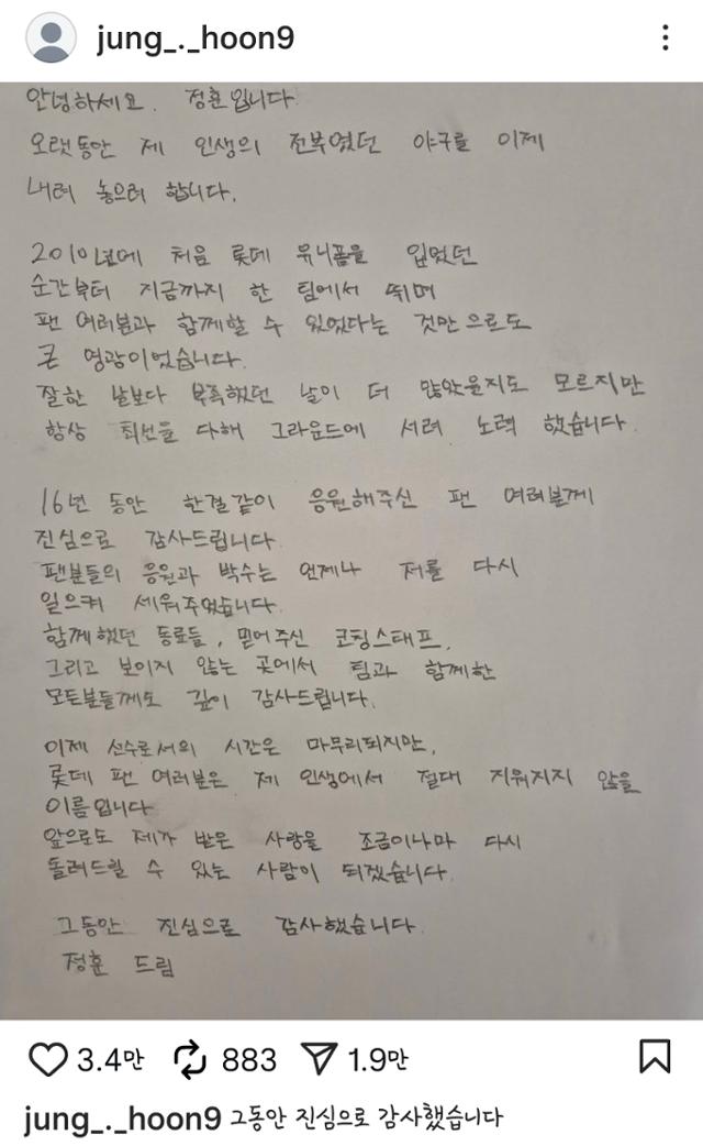 롯데는 15일 “정훈이 2025시즌을 끝으로 은퇴한다”고 밝혔다. 정훈도 이날 자신의 사회관계망서비스(SNS)에 손 편지로 "오랫동안 제 인생의 전부였던 야구를 이제 내려놓으려 한다"며 "2010년 처음 롯데 유니폼을 입었던 순간부터 지금까지 한 팀에서 뛰며 팬 여러분과 함께할 수 있었다는 것만으로도 큰 영광이었다"는 소회를 밝혔다. 이어 "잘한 날보다 부족했던 날이 더 많았을지도 모르지만, 항상 최선을 다해 그라운드에 서려 노력했다"며 "한결같이 응원해주신 팬 여러분께 진심으로 감사드린다"고 덧붙였다.
