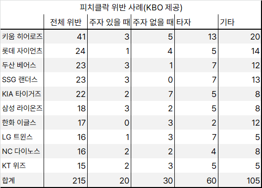 이외에 포수의 준비가 늦어서 나온 위반은 단 1번(NC)이었다. 또 이닝 교대(2분 10초)가 늦은 경우는 10번, 투구 교체 후(2분 10초) 시간을 지체한 경우는 6번으로 나타났다.
