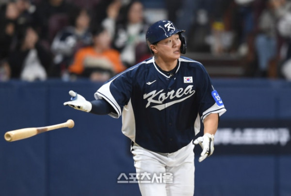 이재원이 9일 서울 고척 스카이돔에서 열린 ‘2025 K-베이스볼 시리즈’ 체코와 2차전 경기 9회초 무사1루 중월홈런을 날리고 있다. 고척 | 최승섭기자 [email protected]