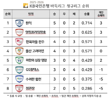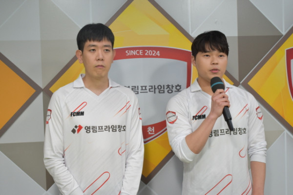 강동윤이 선제점을 넣고, 송지훈이 추가골을 터트리자, 강승민이 결승골로 마무리했다. 18일 한국기원 바둑TV 스튜디오에서 열린 2025-2026 KB국민은행 바둑리그 8라운드 1경기에서 영림프라임창호가 수려한 합천을 3-1로 제압했다.