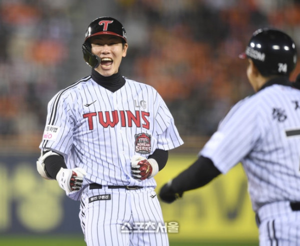 LG 홍창기가 27일 서울 잠실구장에서 열린 2025 KBO 포스트시즌 한국시리즈 2차전 한화와 경기 2회말 1사2루 역전 우중간 안타를 친 후 환호하고 있다. 잠실 | 최승섭기자 [email protected] |