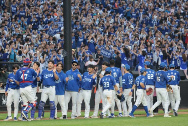 올해 KBO리그 연봉 상위 40명 합계 조사에서 1위에 오른 삼성 라이온즈. 사진은 지난 10월 19일 열린 플레이오프 2차전 한화와 경기에서 이긴 삼성 선수들이 승리를 자축하고 있다. 연합뉴스