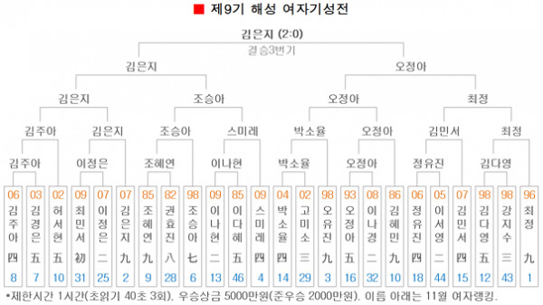 제9기 해성 여자기성전은 지난 7월부터 아마 선발전, 53명이 참가한 예선에 이어 24강 본선 토너먼트(시드 4명, 예선 통과 20명)로 우승 경쟁을 벌였다.