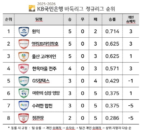 ○● 2025-2026 KB국민은행 바둑리그는 내년 2월까지 8개 팀이 더블리그 방식으로 총 14라운드 56경기를 치른다. 정규리그 상위 4개 팀이 포스트시즌에 진출해 우승 상금 2억 5,000만원을 놓고 최종 대결을 펼친다. 매 경기 5판 3선승제로 진행되며, 기본 시간 1분에 착수할 때마다 15초가 추가되는 피셔 룰 방식이 적용된다.
