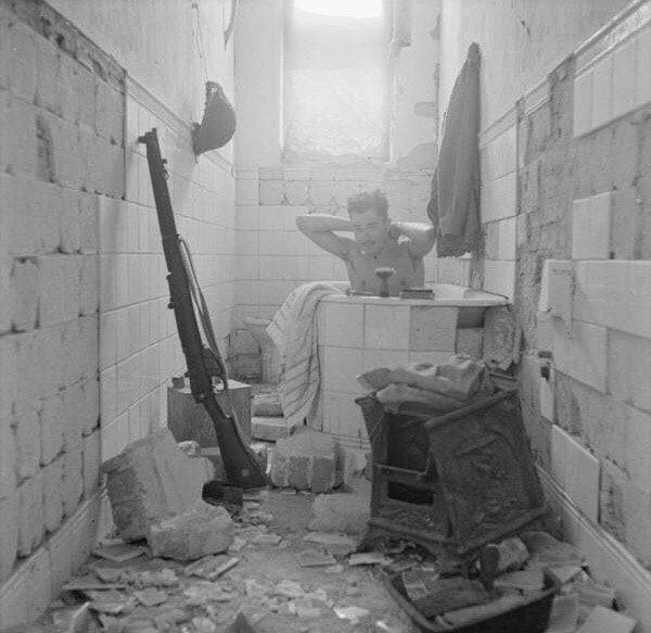 영국 군인은 목욕을 하며 드문 기회를 즐기고 있다.1942년 2월 17일, 리비아의 토브루크. 2차 세계대전의 한가운데서.