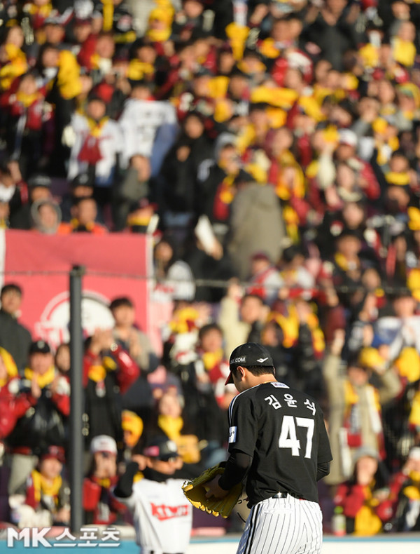 ‘2023 KBO 포스트시즌 한국시리즈’ LG 트윈스와 KT 위즈의 4차전 경기가 2023년 11월 11일 오후 수원KT위즈파크에서 열렸다. 시리즈 전적 2승 1패를 기록한 LG는 좌완 김윤식이 선발로 나섰다. KT는 사이드암 엄상백이 출격했다. 6회말 2사 2루에서 LG 김윤식이 마운드를 내려가고 있다. 사진=천정환 기자